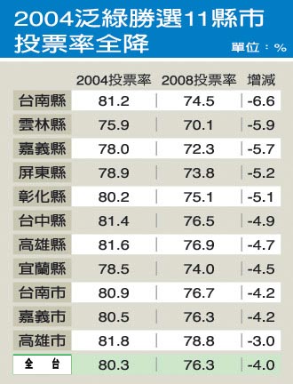 分析各縣市投票率,泛綠優勢縣市選民熱情消退,是綠軍大敗的原因。以2004陳水扁呂秀蓮得票超越連戰宋楚瑜的宜蘭縣、臺中縣、彰化縣、云林縣、嘉義市、臺南縣、臺南市、高雄縣、高雄市等11個泛綠優勢縣市為例,今年除了高雄市,其余10個縣市的投票率都比2004年減少5至7個百分點,降幅超過全臺灣平均值。其中,陳水扁的故鄉臺南縣,投票率由2004年的81%降為75%,跌幅是濁水溪以南縣市中最高的。