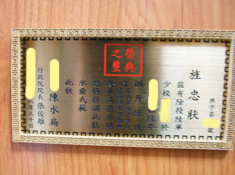 亡故臺軍的“旌忠狀”有“陳水扁”三字,令很多遺族無法向先人交代。(圖片來源:聯合報)