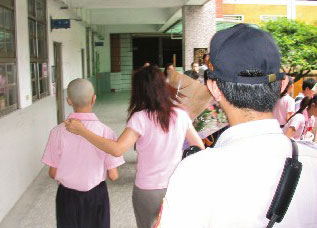 遭母親理成大光頭的六年級女生,昨天到校參加畢業(yè)典禮,父母在場為了她的監(jiān)護權爭吵,校方通知警察、義工媽媽保護她離校。臺灣《聯合報》記者吳佩玲攝