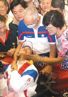 中華臺北隊跆拳道選手蘇麗文(左前)昨晚坐著輪椅返抵臺,父母親(右二、右一)到機場歡迎她,罹癌的蘇爸爸激動擁抱輪椅上的蘇麗文,讓圍觀的人也跟著紅了眼眶。來源:臺灣《聯(lián)合報》