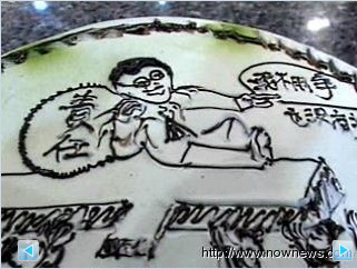 報(bào)道稱,這家糕餅店的蛋糕師傅將蛋糕做成扁扁的茶壺形狀,再噴上一個(gè)“貪”字,旁邊還有小茶杯寫著“珍”(陳水扁妻子吳淑珍)和“扁”,杯子倒過來象征“倒扁”,蛋糕師傅說:“杯子倒過來就是倒扁的意思,水果很多,表示他貪很多的意思。”