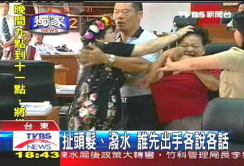 據(jù)臺(tái)媒報(bào)道,臺(tái)東市民代表大會(huì)定期大會(huì)質(zhì)詢中,卻突然上演火爆“全武行”。一位市民代表賴秀星與另一名代表余梅香發(fā)生肢體沖突,2人先互相拉扯頭發(fā),一會(huì)兒又互相扯衣服,沖突造成會(huì)議中斷。一旁的市民代表頻頻勸架,試圖和緩緊張氣氛,但賴秀星難掩心中怒火,再度與余梅香理論,余梅香不甘示弱潑水還擊,2人再度扭打在一起。
