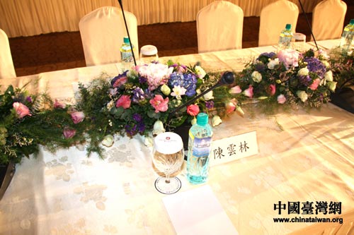 二次“陳江會”即將于4日上午9點(diǎn)開始,現(xiàn)場一切就緒。圖為江丙坤的坐席。中國臺灣網(wǎng) 田云鵬攝