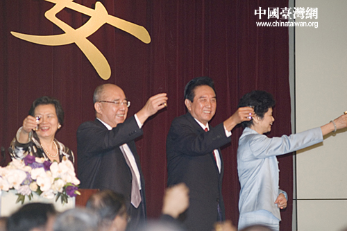 吳伯雄伉儷與陳云林伉儷共同舉杯,與現(xiàn)場賓朋一起為兩岸關(guān)系和平發(fā)展許下美好祝愿。(田云鵬 攝)