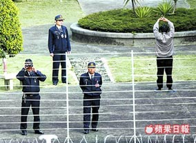 陳水扁昨天放風(fēng)時(shí),故意背對(duì)媒體做體操,看守所管理員也對(duì)媒體進(jìn)行監(jiān)看。來源:臺(tái)灣《蘋果日?qǐng)?bào)》