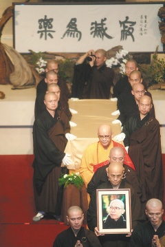 圣嚴(yán)法師荼毘大典昨天在法鼓山舉行起龕儀式,法體由弟子送到荼毘場火化。圖:臺(tái)灣《聯(lián)合報(bào)》