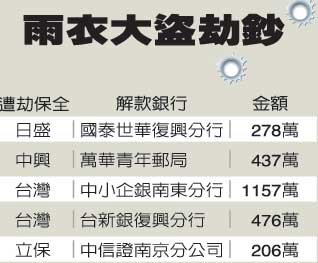 專案小組比對去年臺灣萬華青年郵局、臺灣中小企銀南東分行、臺新復興分行及2002年中信證券公司等四件運鈔保安遭槍擊劫鈔案,發現歹徒都是利用下雨天、穿雨衣作掩護,戴安全帽遮住容貌,逼近保安就開槍恫嚇行搶。