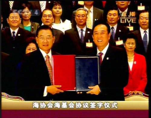 陳云林與江丙坤互換協(xié)議文本。海協(xié)會(huì)會(huì)長(zhǎng)陳云林與臺(tái)灣海基會(huì)董事長(zhǎng)江丙坤26日下午在南京紫金山莊會(huì)議中心紫金廳簽署《海峽兩岸空運(yùn)補(bǔ)充協(xié)議》、《海峽兩岸金融合作協(xié)議》、《海峽兩岸共同打擊犯罪及司法互助協(xié)議》。(中央電視臺(tái)截圖)