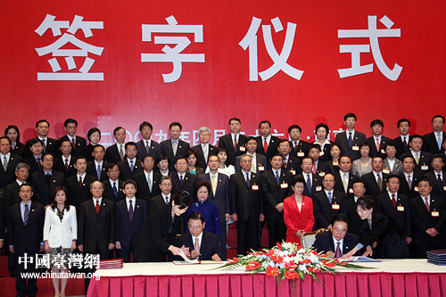 海協會會長陳云林與海基會董事長江丙坤簽署協議。26日下午三時許,海協會會長陳云林與臺灣海基會董事長江丙坤在南京紫金山莊正式簽署《海峽兩岸空運補充協議》、《海峽兩岸金融合作協議》、《海峽兩岸共同打擊犯罪及司法互助協議》。(中國臺灣網 鐘寶華 攝)