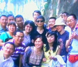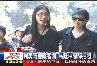 周美青一行人參觀了九曲洞、燕子口,還碰上了大陸觀光客,他們看到了馬英九夫人,當然得把握機會搶著合影留念。周美青也很配合,還和大家一起唱歌合照,展現隨和的一面。