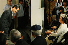 蕭萬長(左)在致詞前,向柏楊的妻子張香華(右)鞠躬致意。