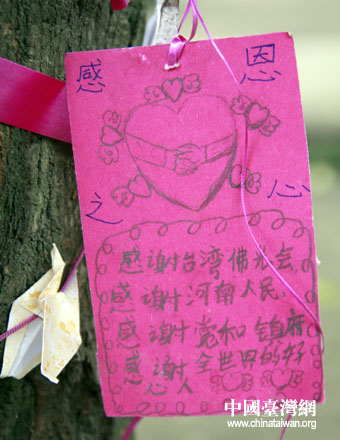 一走進(jìn)彰明中學(xué),兩岸記者就發(fā)現(xiàn)綠植上掛滿了各種卡片、千紙鶴等,仔細(xì)一看,發(fā)覺字里行間都是學(xué)生們親筆寫下的感謝與祝福。校長劉建雄告訴記者,這些都是學(xué)生們?yōu)楸磉_(dá)對臺灣佛光會及對口援建省份河南等各地的愛心人士而精心制作,“5.12”地震1周年之際,學(xué)生們還將寫感謝信、感恩卡,在5月12日之前寄到臺灣國際佛光會總部,再表感謝。