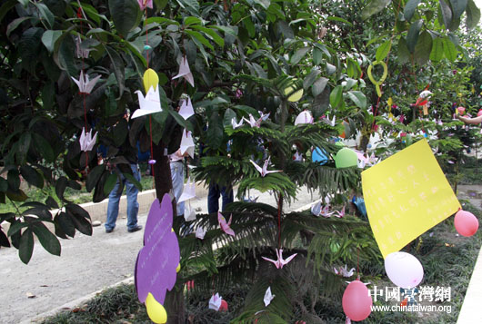 彰明中學(xué)學(xué)校的綠植上,掛滿了學(xué)生寫下的感恩與祝福。(中國臺灣網(wǎng) 鐘寶華 攝)