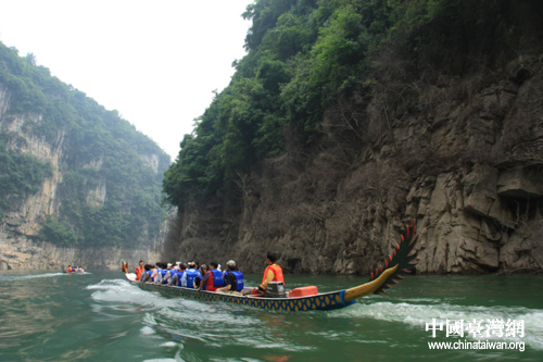 臺灣嘉賓乘龍舟游覽絕壁林立的九畹溪(中國臺灣網 焦瑩瑩 攝)