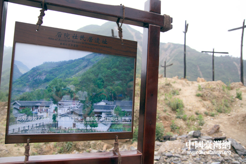 東河口地震遺址公園,圖中此地海拔778米,被掩埋110米。背景中是川北民居中傳統的“穿斗挑梁”殘骸,它們在地震后被樹立起來,紀念罹難的同胞。(中國臺灣網 田云鵬 攝)