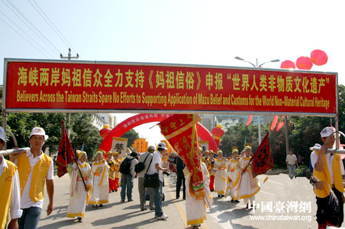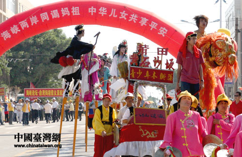 為歡迎臺灣媽祖信眾,湄洲民眾獻上精彩的民俗踩街表演。(中國臺灣網記者 張弛 攝)