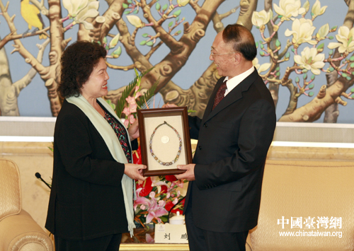 22日下午,中國奧委會主席劉鵬在北京飯店會見了高雄市市長陳菊一行。圖為陳菊向劉鵬贈送臺灣少數民族傳統工藝品。(中國臺灣網 田云鵬 攝)