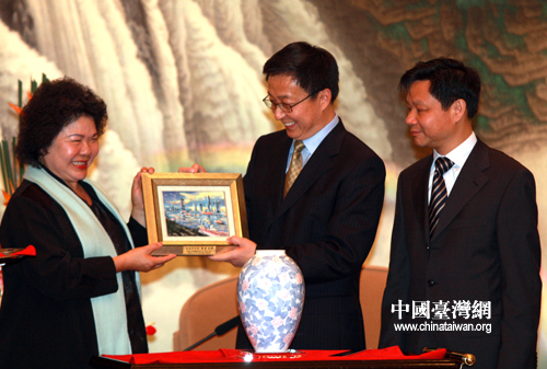5月23日下午,上海市市長韓正在上海興國賓館會見了高雄市市長陳菊,韓正向陳菊贈送精美禮品。(中國臺灣網 田云鵬 攝)