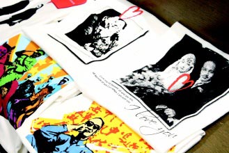 蔣友柏負責操刀的“蔣生活運動”強調兩蔣的愛情故事,將兩蔣與另一半濃情蜜意的歷史圖片印在T恤上。來源:臺灣《聯合報》