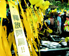 圖為挺陳水扁民眾昨天前往臺北看守所集結(jié),在警方架設(shè)的拒馬上綁滿黃絲帶及氣球。圖片來源:臺灣《聯(lián)合晚報》