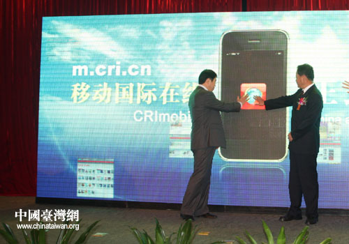 “移動國際在線”今天在北京正式啟動,圖為國家廣電總局副局長田進(左)、國際廣播電臺臺長王庚年按下啟動圖標。(中國臺灣網 張弛 攝)