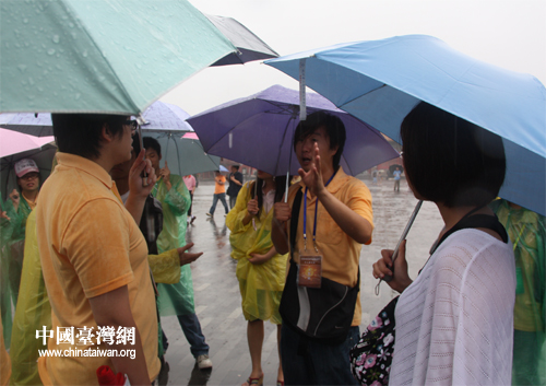 夏令營(yíng)團(tuán)員們雨中認(rèn)真聽(tīng)導(dǎo)游講解(中國(guó)臺(tái)灣網(wǎng) 張蕾 攝)