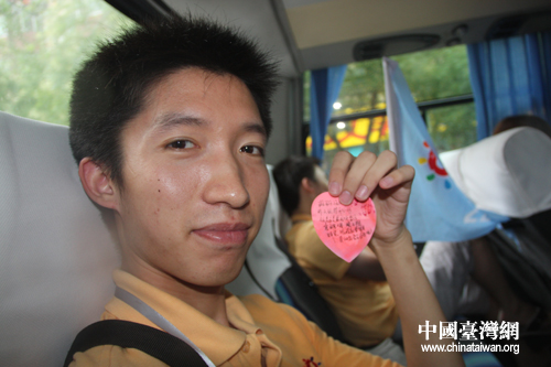 青年志愿者手拿愛(ài)心圖片,用真情溫暖臺(tái)灣青年(中國(guó)臺(tái)灣網(wǎng) 張蕾 攝)