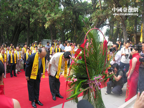 程建人與汪志剛代表兩岸文化界人士向黃帝陵敬獻(xiàn)花籃。(中國臺(tái)灣網(wǎng) 蕪?fù)?攝)