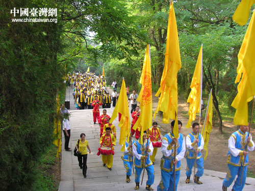海峽兩岸文化界人士在祭祀樂隊(duì)的引領(lǐng)下緩步登上橋山 (中國臺(tái)灣網(wǎng) 蕪?fù)?攝)