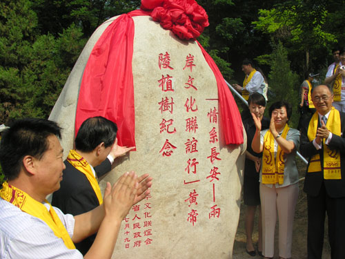 隨后,程建人與焦仁和同延安市、黃陵縣政府領(lǐng)導(dǎo)一起,為植樹紀(jì)念碑揭幕。紀(jì)念碑上書18個(gè)大字:“情系長安——兩岸文化聯(lián)誼行”黃帝陵植樹紀(jì)念。