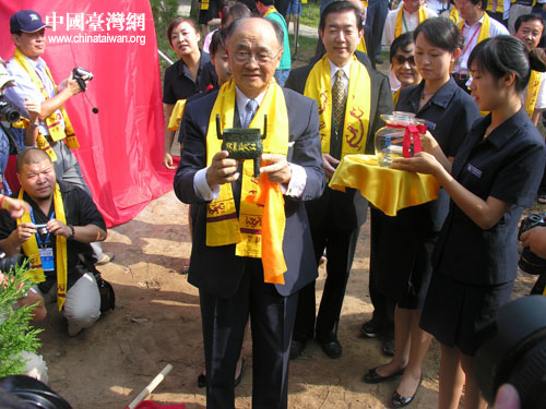 在一棵小樹前,參加“情系長安——兩岸文化聯(lián)誼行”活動(dòng)的臺灣嘉賓團(tuán)長程建人與榮譽(yù)團(tuán)長焦仁和,分別拿出了專程從臺灣帶來的阿里山的土和日月潭水,輕輕倒進(jìn)樹坑中,寓意兩岸同胞同根同祖、一脈相承,中華文化源遠(yuǎn)流長,萬古長青。阿里山土與日月潭水倒入黃陵的土中后,馬上與橋山黃陵的泥土混為一色,分不出哪是來自臺灣的土,哪是黃陵的土。