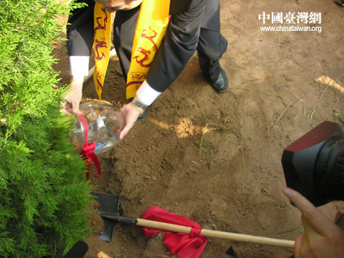 焦仁和把專程從臺灣帶來的日月潭水輕輕倒進(jìn)樹坑中。(中國臺灣網(wǎng) 蕪?fù)?攝)