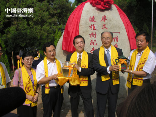 程建人、焦仁和與延安市、黃陵縣政府領(lǐng)導(dǎo)一起,為植樹紀(jì)念碑揭幕。(中國臺灣網(wǎng) 蕪?fù)?攝)