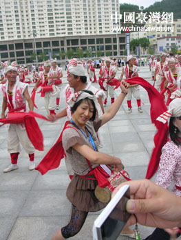 臺北藝術大學舞蹈系主任鄭淑姬與腰鼓手合影留念 (中國臺灣網 蕪同 攝)
