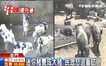 中國臺(tái)灣網(wǎng)7月23日消息 據(jù)臺(tái)灣TVBS電視臺(tái)報(bào)道,臺(tái)灣金門一位許姓民眾,3年前向金門畜產(chǎn)試驗(yàn)所買了一對(duì)“迷你豬”,養(yǎng)了3年后,“迷你豬”卻變成100公斤重的大豬,還生了很多大豬,他決定要抗議,把“這些不迷你的迷你豬”,還給金門畜產(chǎn)試驗(yàn)所。