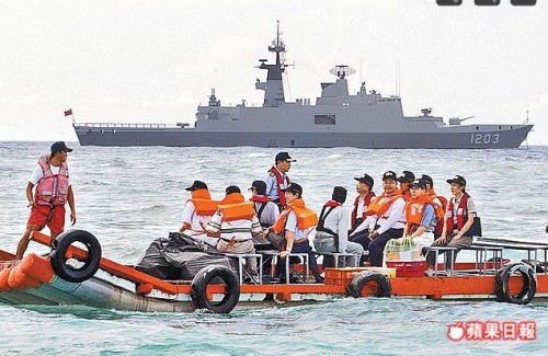 賴佳雯說,她2003年采訪“內(nèi)政部長(zhǎng)”余政憲赴南沙群島時(shí),與孫海濤結(jié)識(shí)并定情。圖片來源:臺(tái)灣《蘋果日?qǐng)?bào)》