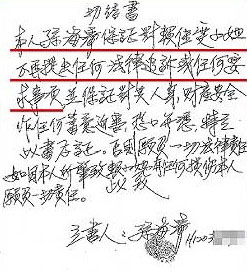 賴佳雯向《蘋果日?qǐng)?bào)》出示孫海濤3年前簽下不對(duì)女方提出任何“法律”追訴的“切結(jié)書”證明兩人關(guān)系,及今年6月她委請(qǐng)律師對(duì)孫寄出的律師函泣訴:“這幾年來我什么名分都不要,只要他陪我將小孩處理掉就好,想不到他這么狠就這樣人間蒸發(fā)!”她說婚外情曝光,恐被其妻提告通奸、妨害家庭,但她仍不顧一切,強(qiáng)調(diào)一定要孫海濤還她一個(gè)公道。