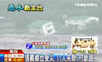 位于東埔村的沙里仙養鱒場,在風雨中被催毀,包括老板和員工總共11個人都失聯;另外東埔村第一鄰,也有300個人無家可歸,全部被暫時安罝在活動中心;神木村也爆發泥石流,15戶民宅頓時被沖毀倒塌,幸好300個人緊急疏散,目前都沒有生命危險。
