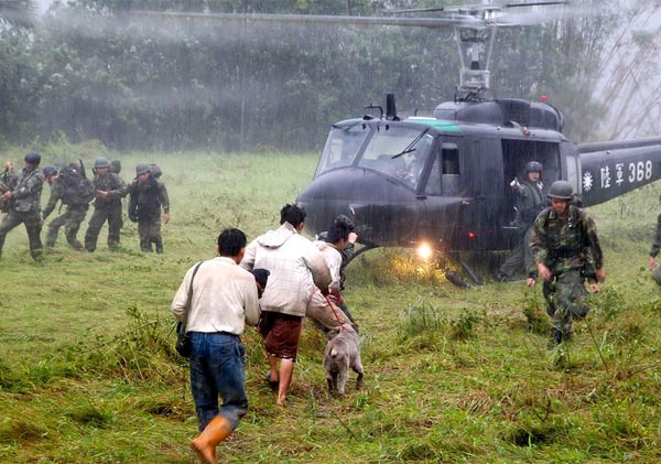 報道稱,臺軍陸航政戰主任李智雄表示,從8月10日起至14日下午為止,臺軍陸航共出動各型直升機643架次、953人次的軍士官兵參與救災,搭救災民逾2500人,運補物資5萬多箱。