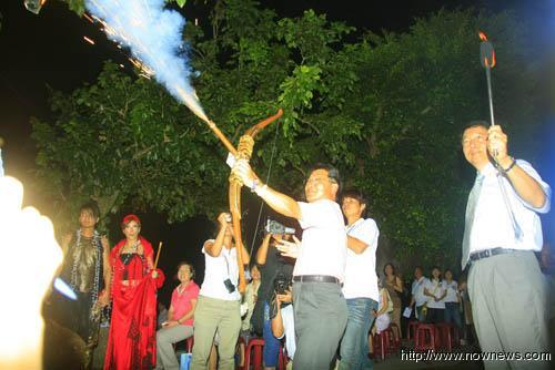宜蘭縣長呂國華拉弓點(diǎn)亮情人節(jié)星光鵲橋。圖片來源:臺灣“今日新聞”
