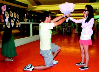 據(jù)臺灣《聯(lián)合報》報道,住在桃園縣的福至(左)與女友惠琦(右)愛情長跑多年,日前惠琦與親友外出旅游,福至找來同學(xué)兼死黨策劃到機(jī)場浪漫求婚,當(dāng)惠琦走進(jìn)機(jī)場大廳,福至獻(xiàn)上一束鮮花,然后再當(dāng)著所有旅客的面單膝跪地求婚,完惠琦驚喜之余含羞點(diǎn)頭。