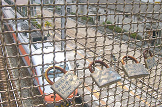 臺中縣豐原火車站后方老天橋有個求愛勝地,許多年輕男女在天橋上鐵絲護欄掛上求愛鎖。來源:臺灣《聯合報》