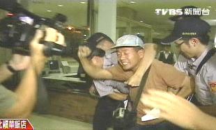 達賴今日結束5天行程返回印度,在其下榻的福華飯店,一大清早就有示威民眾激動抗議,還與警方發生拉扯,表達對達賴此行的強烈不滿。圖片來源:臺灣TVBS電視臺