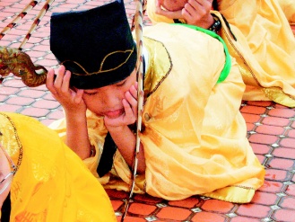 宜蘭縣孔廟祭孔活動,一名六佾舞舞生因跪太久了,索性用手撐著頭,小憩片刻,忙里偷閑一番。來源:臺灣《聯合報》