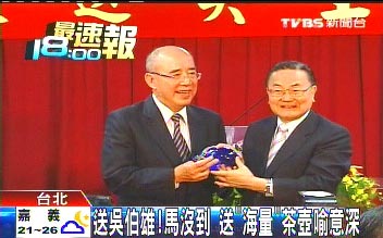 國民黨第18次全代會即將于本周六(17日)登場,新舊主席將進行交接,國民黨今日下午特別為將卸任的黨主席吳伯雄舉辦歡送茶會,馬英九托人送吳伯雄“海量”藝術茶壺。來源:臺灣TVBS電視臺