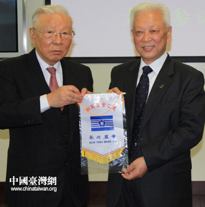 民革中央主席周鐵農(右)與臺灣新同盟會會長許歷農(左)互贈禮物。(中國臺灣網 高斯斯 攝)