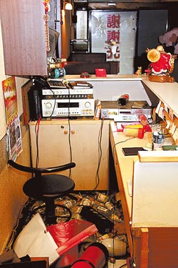 一間卡拉OK遭臺北縣警察率眾砸店,狼藉一片。 來源:臺灣《中國時報》