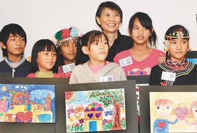透過繪畫分享災后心聲,周美青(后排中)教孩子勇敢面對未來。 來源:臺灣《聯合報》