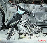 肇事摩托車事發時被砂石車輪卡住磨地,后半截幾乎消失不見。圖片來源:臺灣《蘋果日報》
