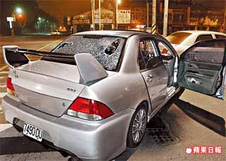 鄭姓駕駛的改裝轎車被砸得一塌糊涂。 來源:臺灣《蘋果日報》